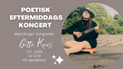 Poetisk eftermiddags koncert med Singer-Songwriter Gitta KaasLørdag d. 1. nov. 2025, kl. 13.00 - kl. 14.30Hjerteland Poetisk eftermiddags koncert med Singer-Songwriter Gitta KaasLørdag d. 1. nov. 2025, kl. 13.00 - kl. 14.30Hjerteland